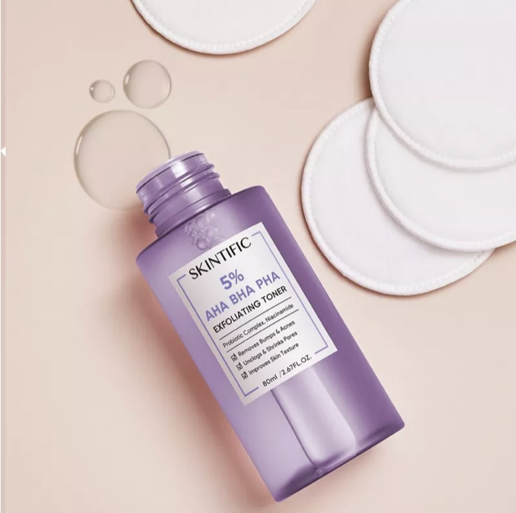 Skintific 5% AHA BHA PHA Exfoliating Toner, diiformulasikan dengan kombinasi AHA, BHA, PHA, dan Probiotik, toner ini membersihkan pori-pori dan meratakan tekstur kulit. Tidak menyebabkan sensasi cekit atau kering, toner ini enak digunakan untuk perawatan kulit sehari-hari.